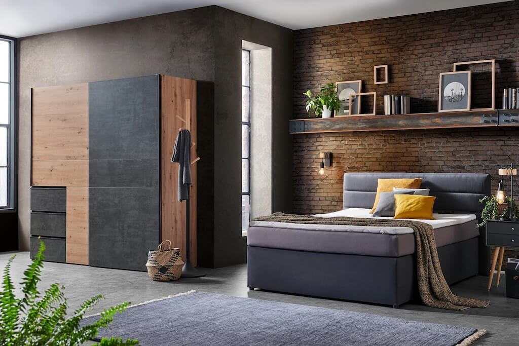 Skvelo zafunguje pre milovníkov moderného industriálneho štýlu spálne spojenie skrine v teplých hnedých tónoch a antracitových plôch spolu s boxspring posteľou, ktorá je čalúnená v tmavosivom textilnom poťahu.